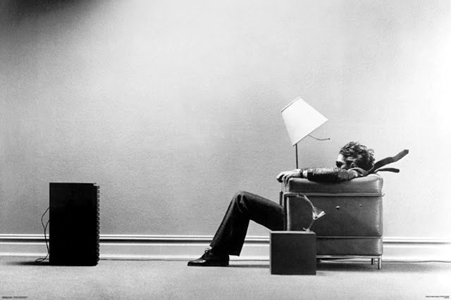"a man is shown desperately clinging to the armrests but defiantly looking ahead at the source of the music through sunglasses, though calmly catching his drink before it slides off the end table."