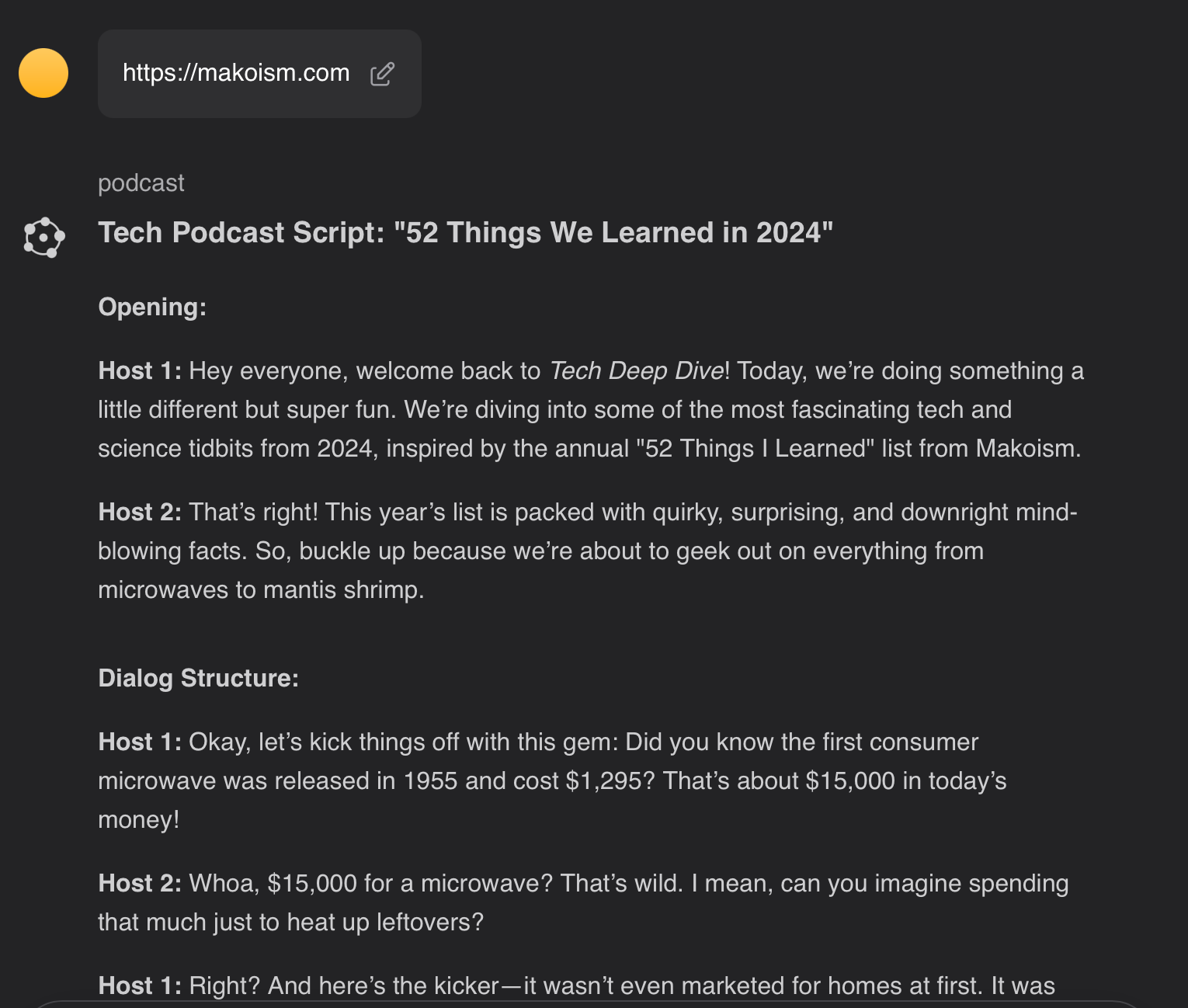 For example, "!podcast https://makoism.com/52-things-i-learned-2024/", which is the "52 Things I Learned" post from last week, it returns: