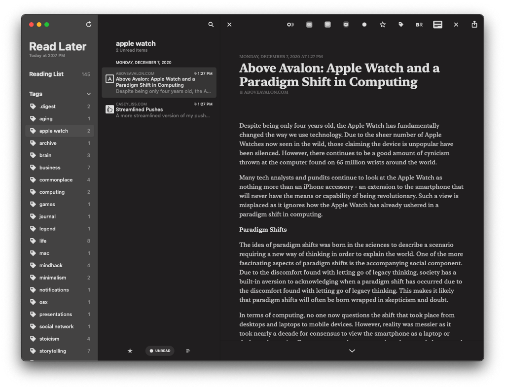 If there’s content that I want to save in the digital mind palace, I save and tag it within Reeders iCloud Read Later service.