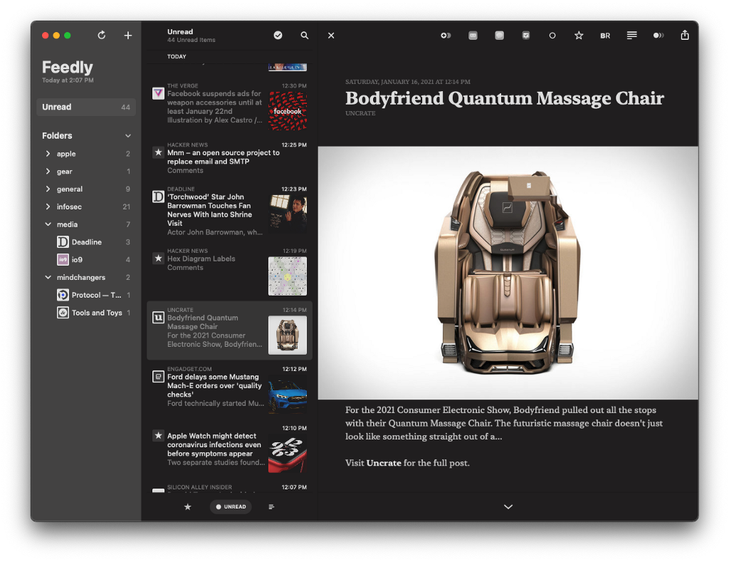 Ever since Google abandoned Google Reader in 2013, I have been using Feedly as the backend service to handle my RSS feeds. You can think of Feedly as a site/storage that allows you to read all of your publications, blogs, and newsletters. That’s the wonderful thing when tech is designed to inter-operate, it can be used on the web, their mobile app, or a variety of other RSS (Really Simple Syndication) readers such as Reeder (which I use; more below). It was super easy to import my legacy “feeds” into Feedly and be on my way.